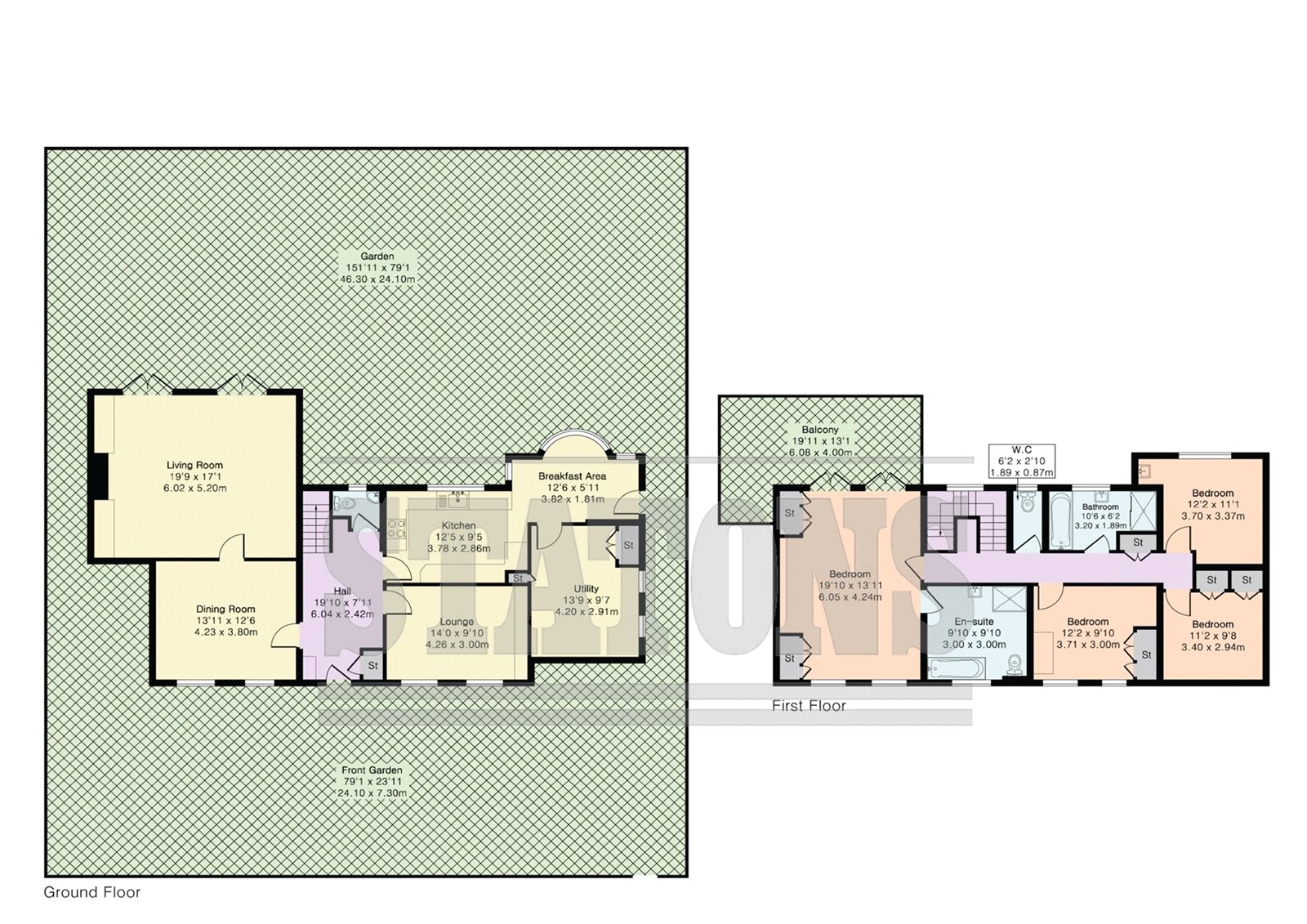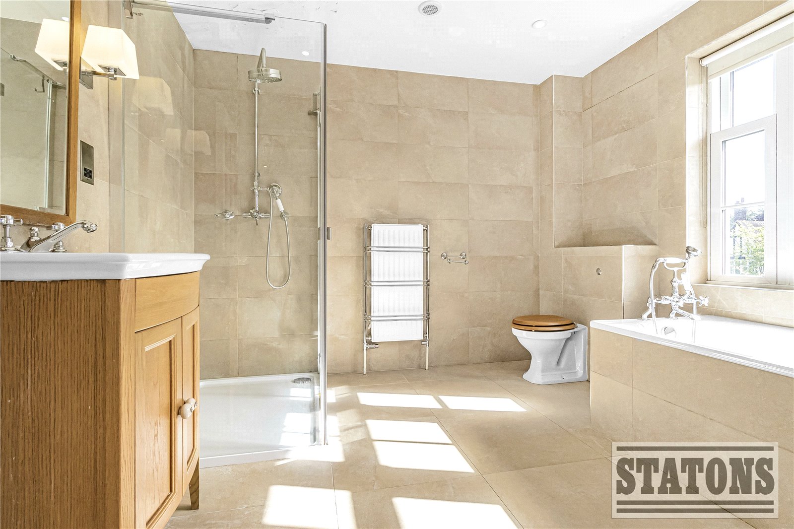 The first floor is arranged around a central landing. The principal bedroom includes access to a balcony and benefits from an en-suite shower room. There are three further bedrooms, all served by a family bathroom and an additional separate WC.