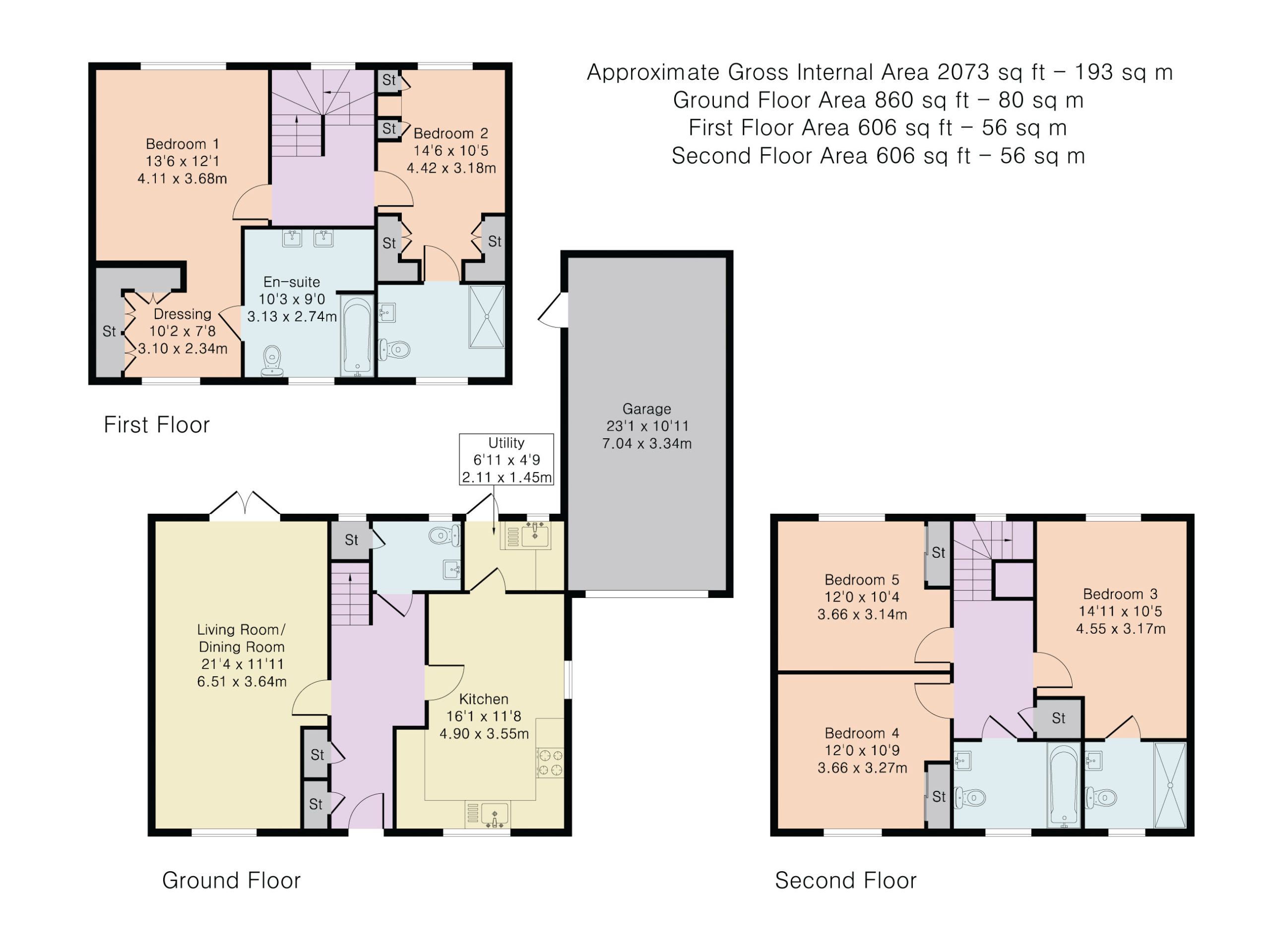 The second floor offers three further double bedrooms with storage, including a third bedroom with en-suite facilities, and a stylish family bathroom completing the level.