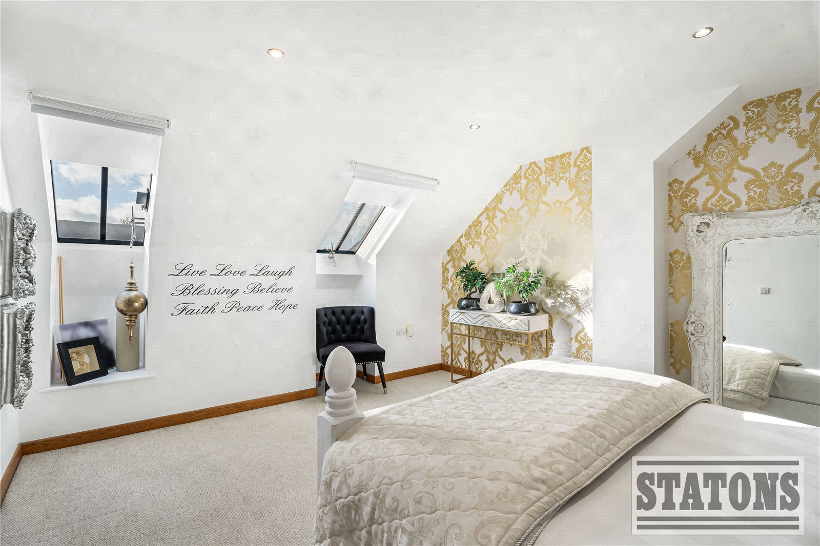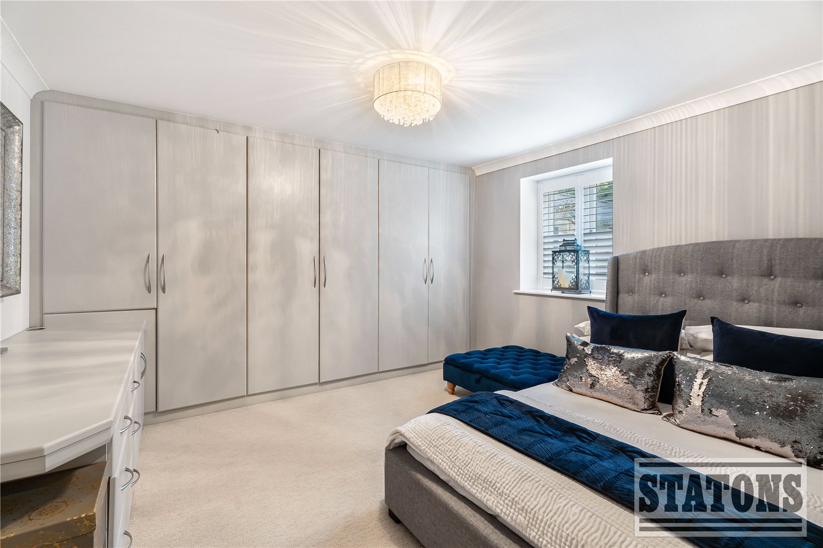 A second spacious double bedroom, also with fitted wardrobes, is served by a striking family bathroom showcasing textured tiling and a freestanding bath — a true spa-like retreat.