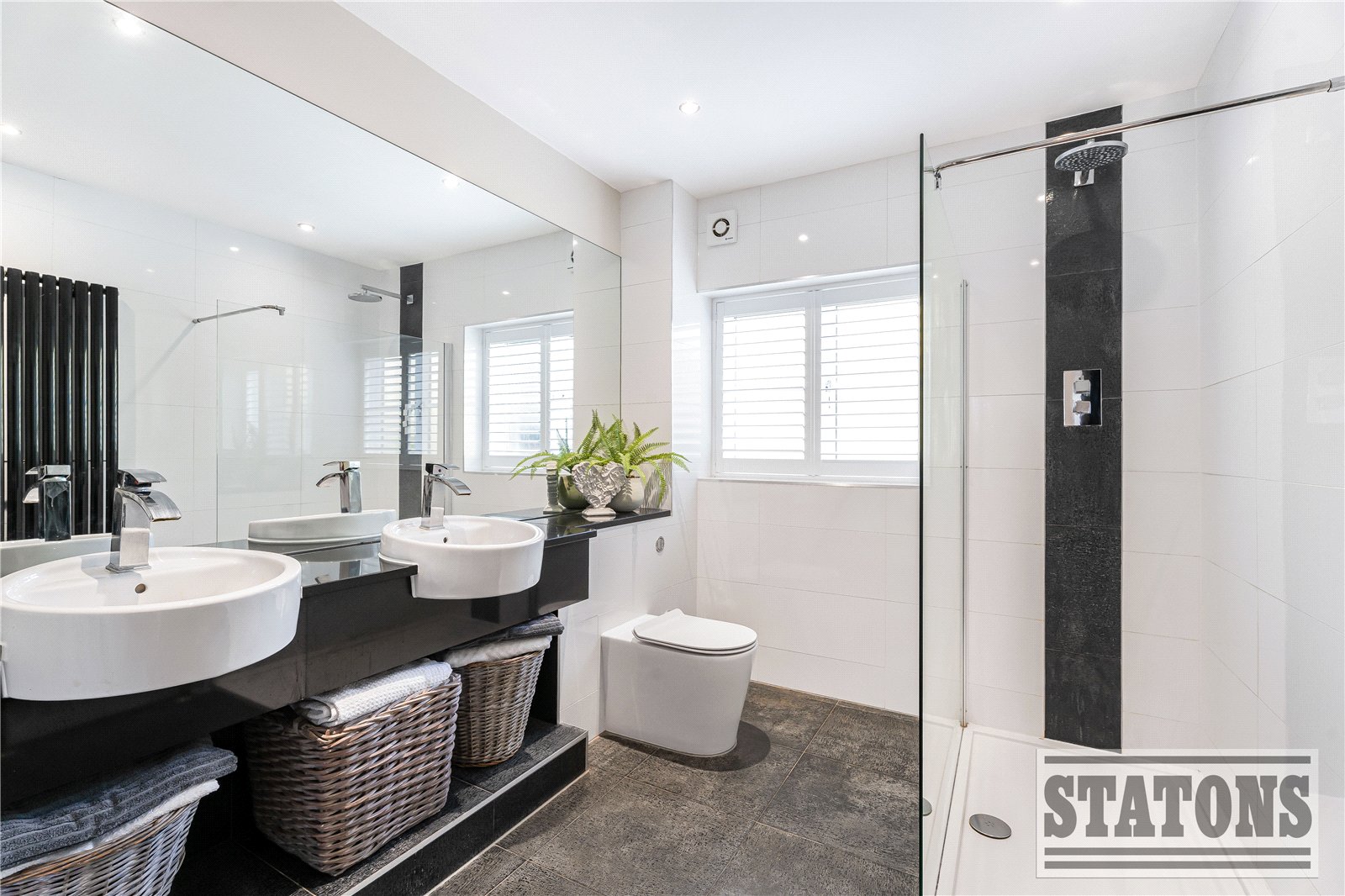 Upstairs, two additional double bedrooms await, including a guest suite with fitted wardrobes and a sleek, contemporary en-suite shower room.