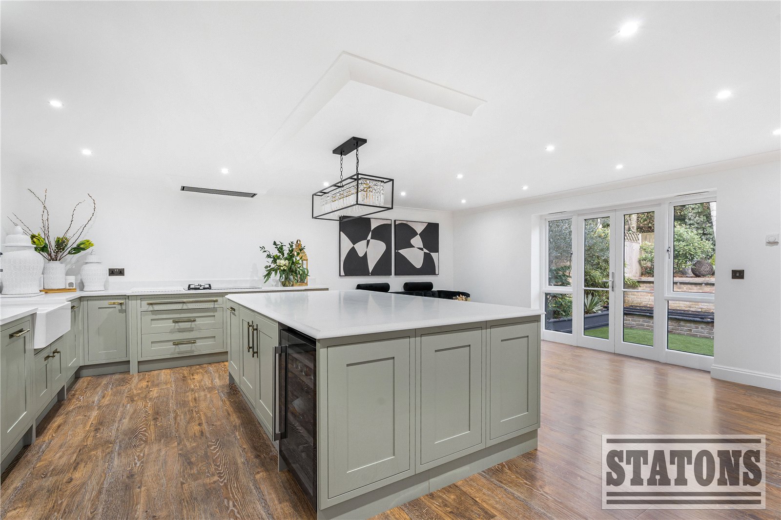 At the heart of the home is the newly installed luxury kitchen, complete with granite worktops, a central island, extensive cabinetry including a built-in larder, and a full suite of integrated appliances. French doors open directly onto the rear garden, blending indoor and outdoor living.
