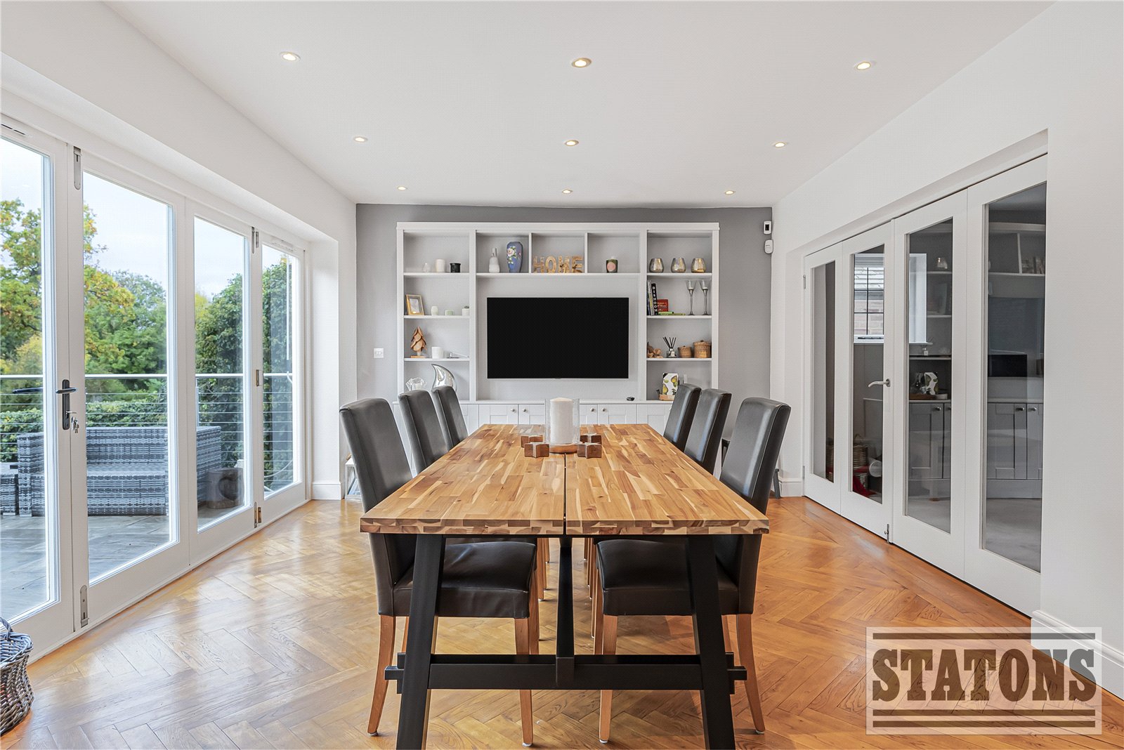 To the rear, a beautifully landscaped and private garden offers a large sun terrace – ideal for outdoor entertaining and family relaxation. Additional benefits include a carriage driveway providing ample off-street parking, and a detached garage.