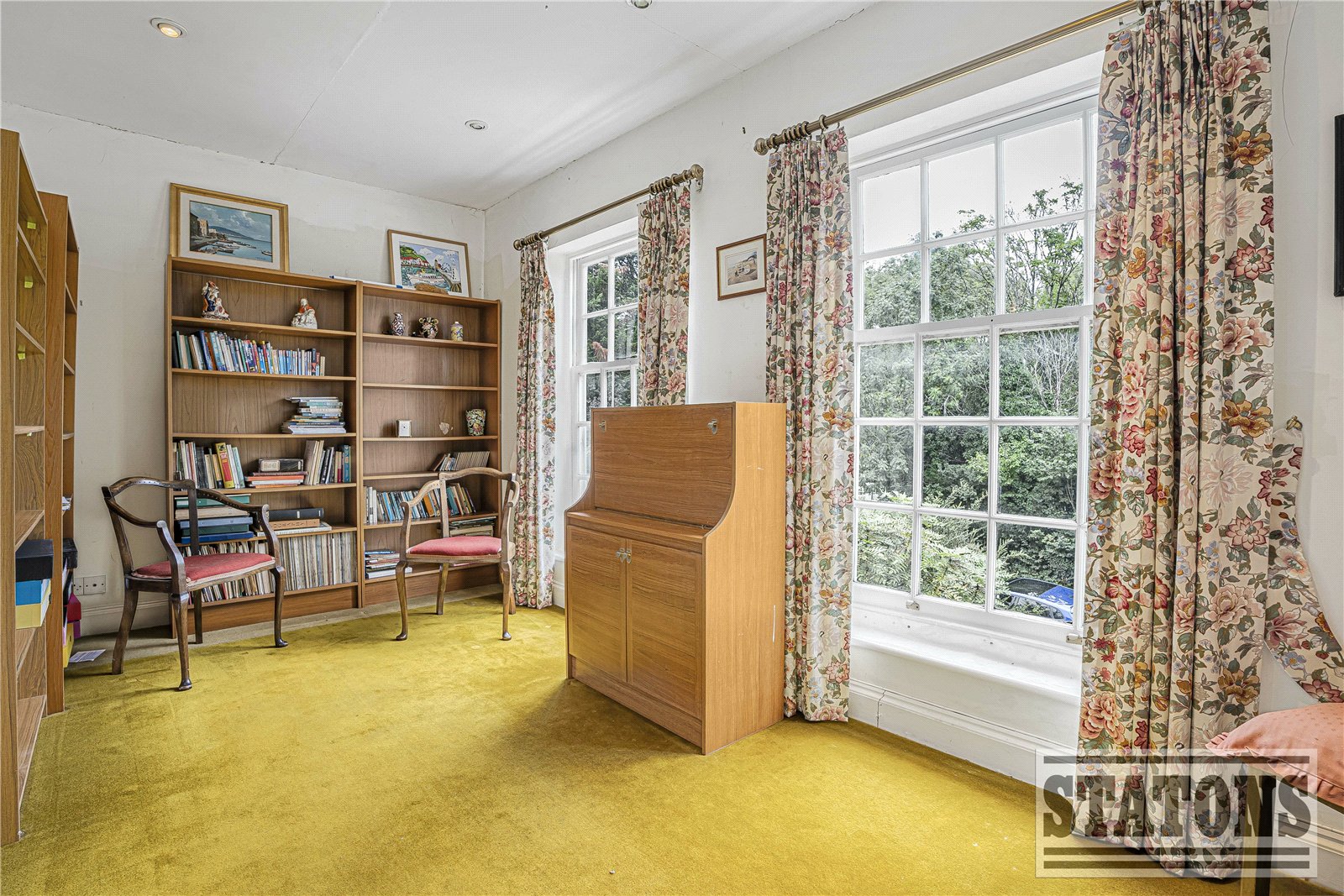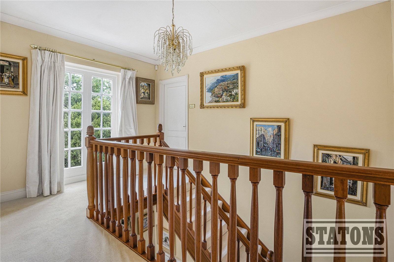 Upstairs, the generous landing leads to four beautifully proportioned bedrooms, including a charming master suite with en-suite bathroom and ample fitted storage. Two further doubles and a fourth bedroom enjoy verdant views over the gardens and woodland beyond, served by a family bathroom and plentiful storage options.