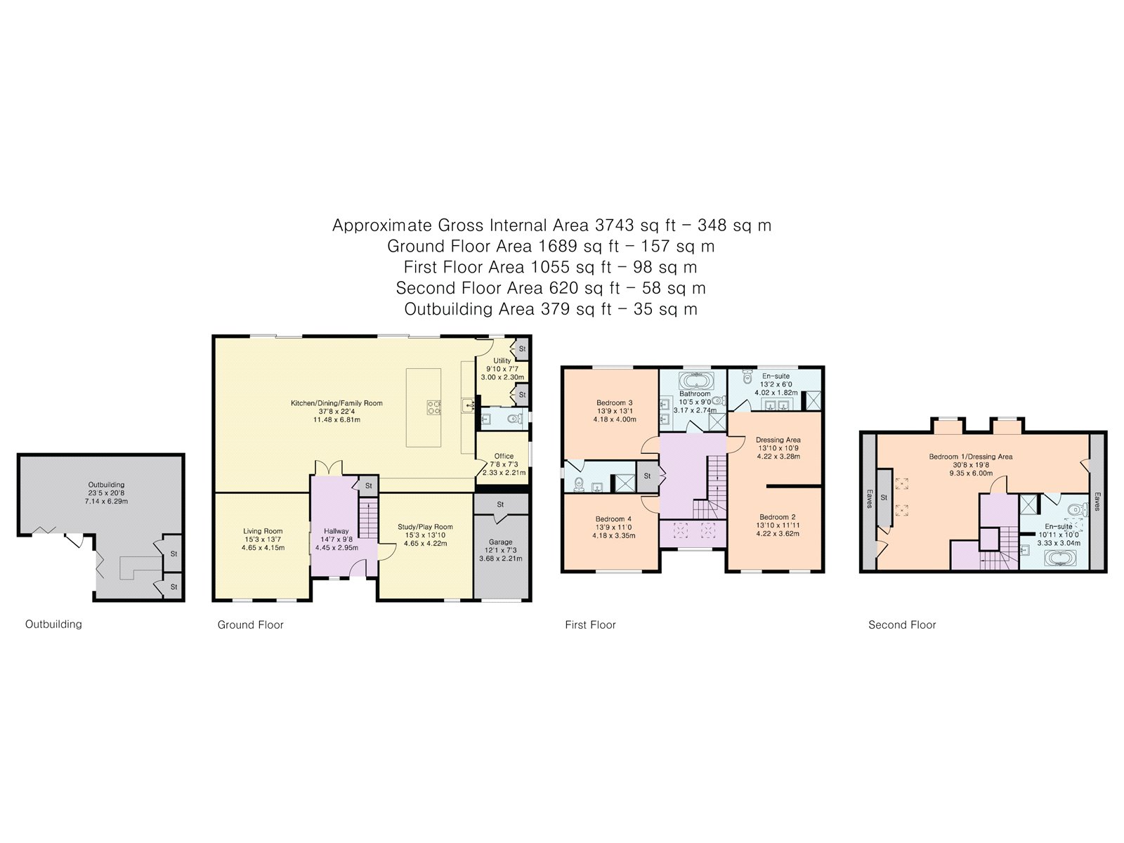 On the first floor there are three double bedrooms with en-suite and dressing room to bedroom two, further en suite to bedroom three and a family bathroom. The beautiful principal bedroom with stunning dressing area and en suite spans the entire second floor.