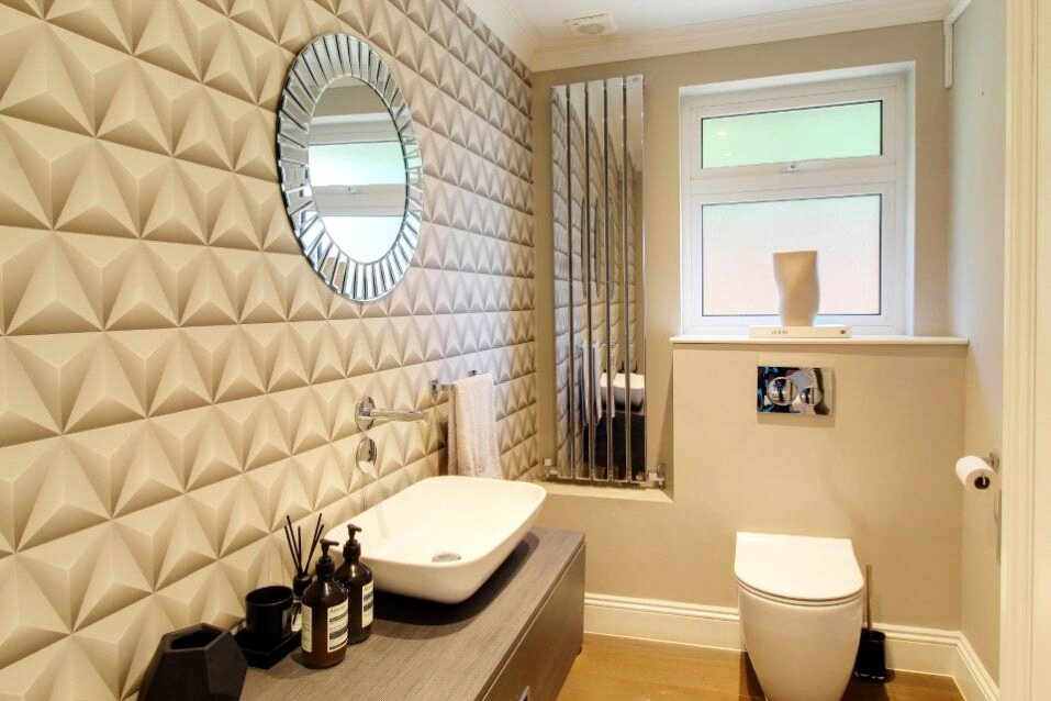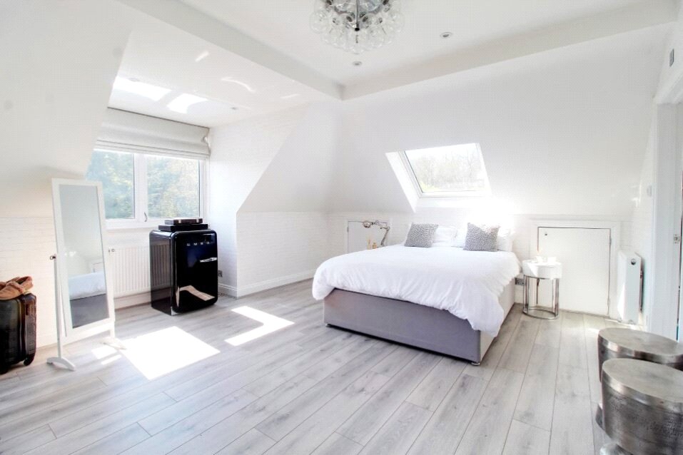 Upstairs, the principal bedroom suite offers a private retreat, featuring a walk-in dressing room and a luxury en suite bathroom. Three further generously sized bedrooms are served by a high-specification family bathroom. On the second floor, a large fifth bedroom or games room benefits from its own en suite, offering perfect accommodation for guests or teenagers.
