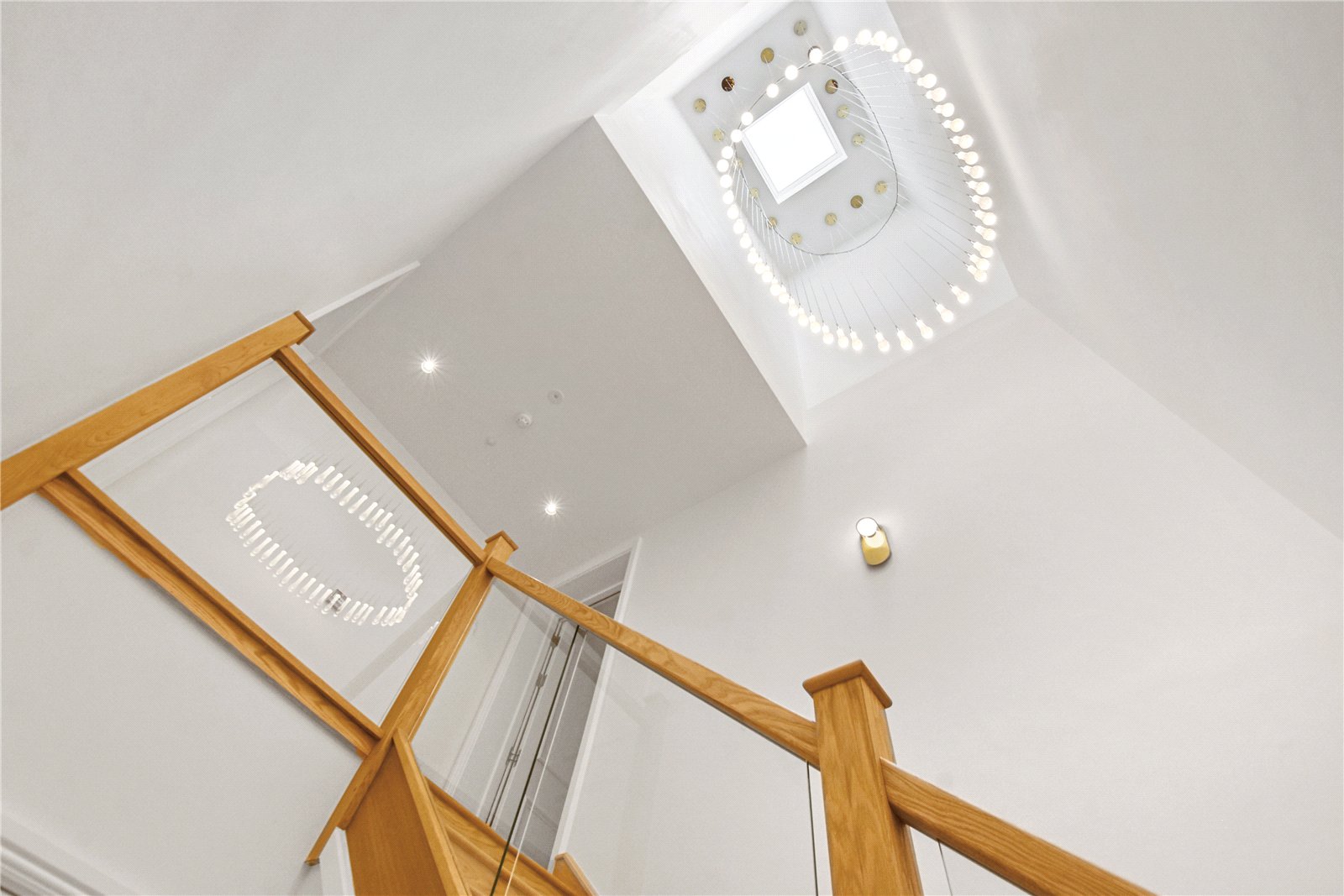 Video entry system and impressive communal hallway with oak staircase and feature lighting