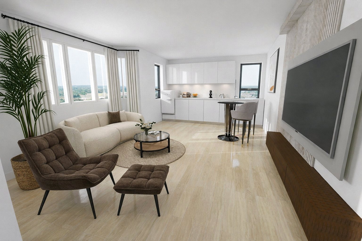 A first floor one bedroom + study apartment with allocated parking, offering an open-plan kitchen/living/sleeping area, providing a versatile and comfortable space for modern living.