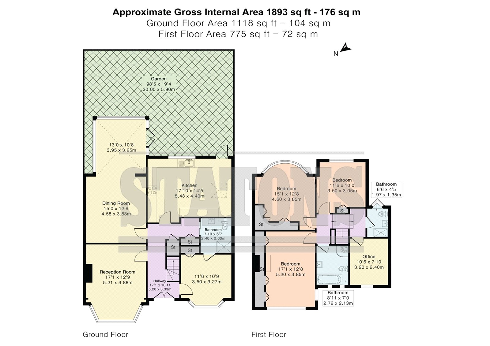 Upstairs, four well-proportioned bedrooms are arranged across the first floor, including one with en-suite facilities, as well as two further family bathrooms. A dedicated office provides flexibility for modern living, whether as a study, nursery, or dressing room.