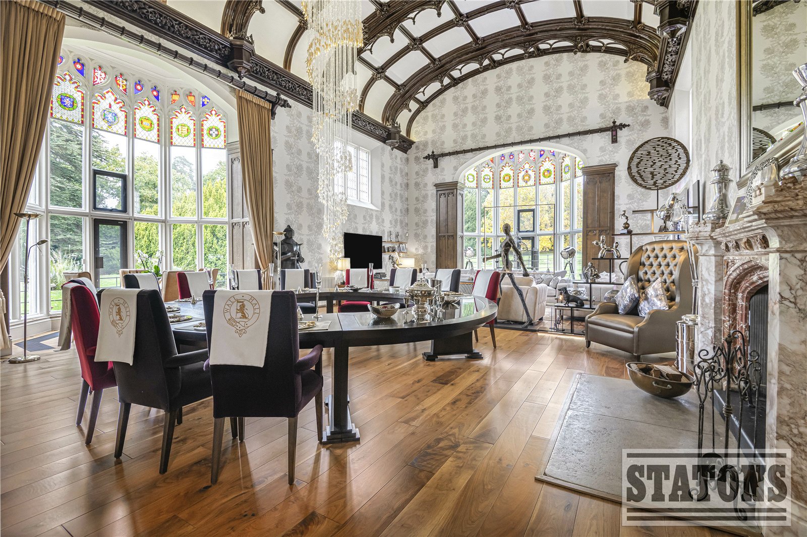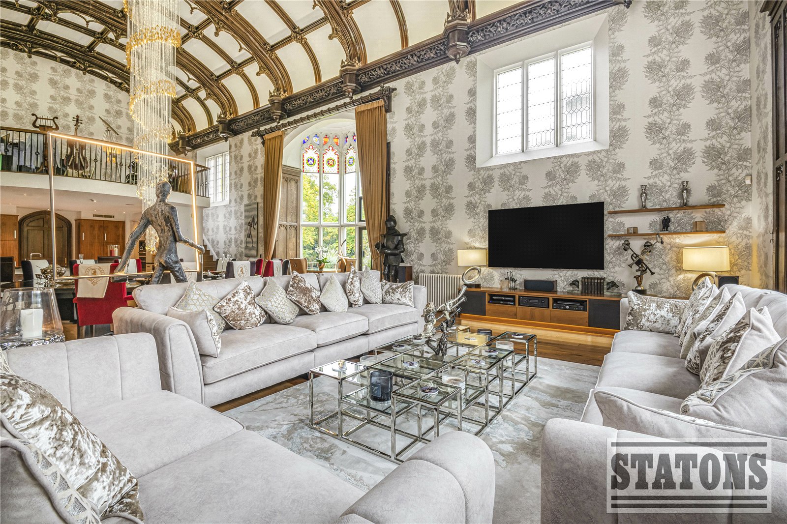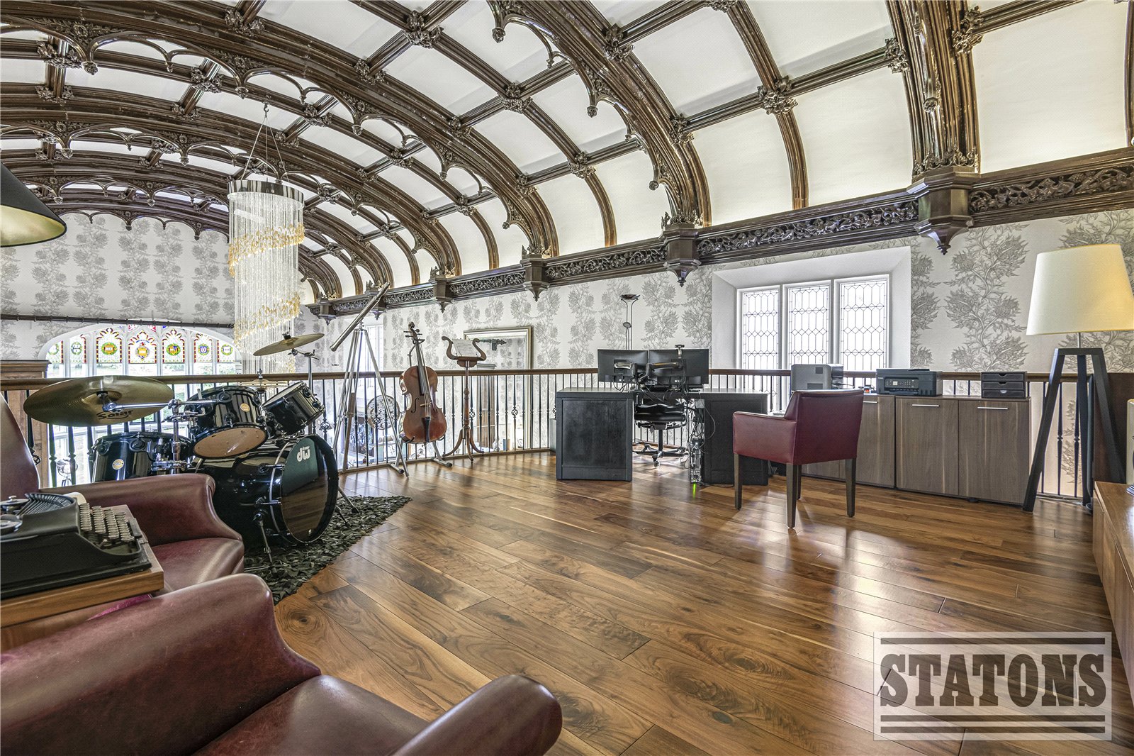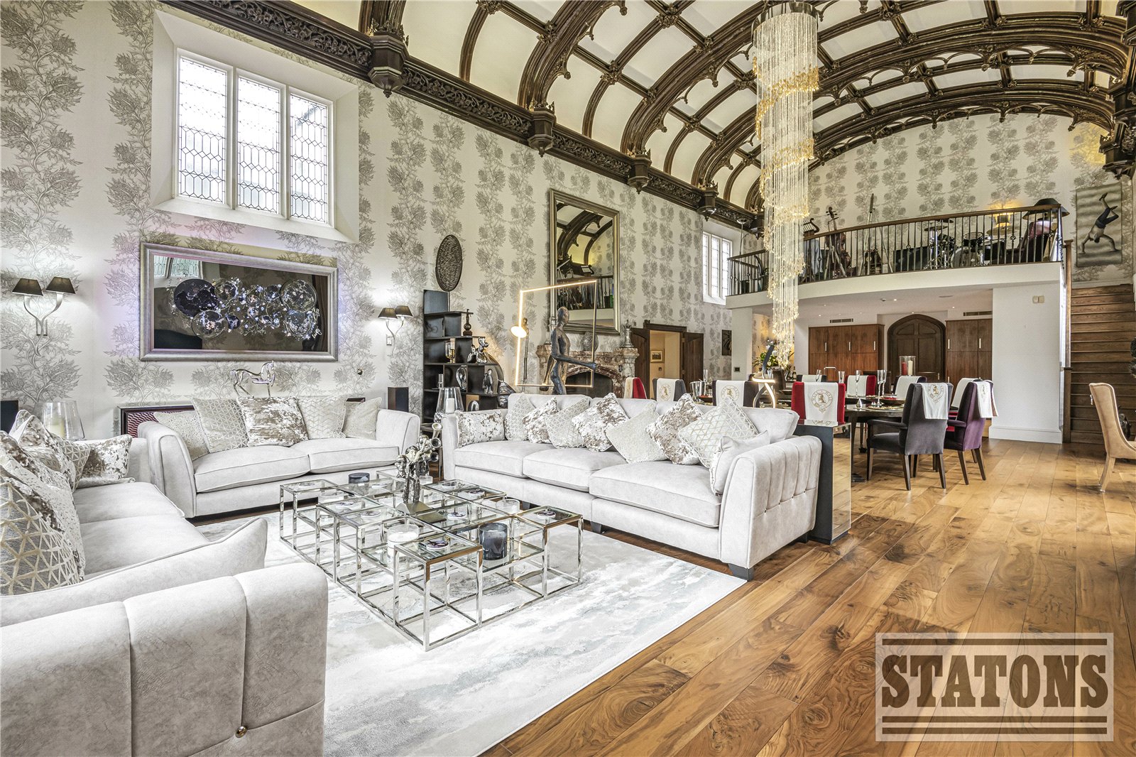 This remarkable home, extending to approximately 4,000 sq ft, is accessed via an imposing communal hall that evokes the grandeur of a bygone era. Inside, a majestic converted ballroom now serves as a stunning open-plan lifestyle space, seamlessly combining a reception area, dining room, bespoke kitchen, and mezzanine level beneath soaring ceilings and exquisite architectural detailing.