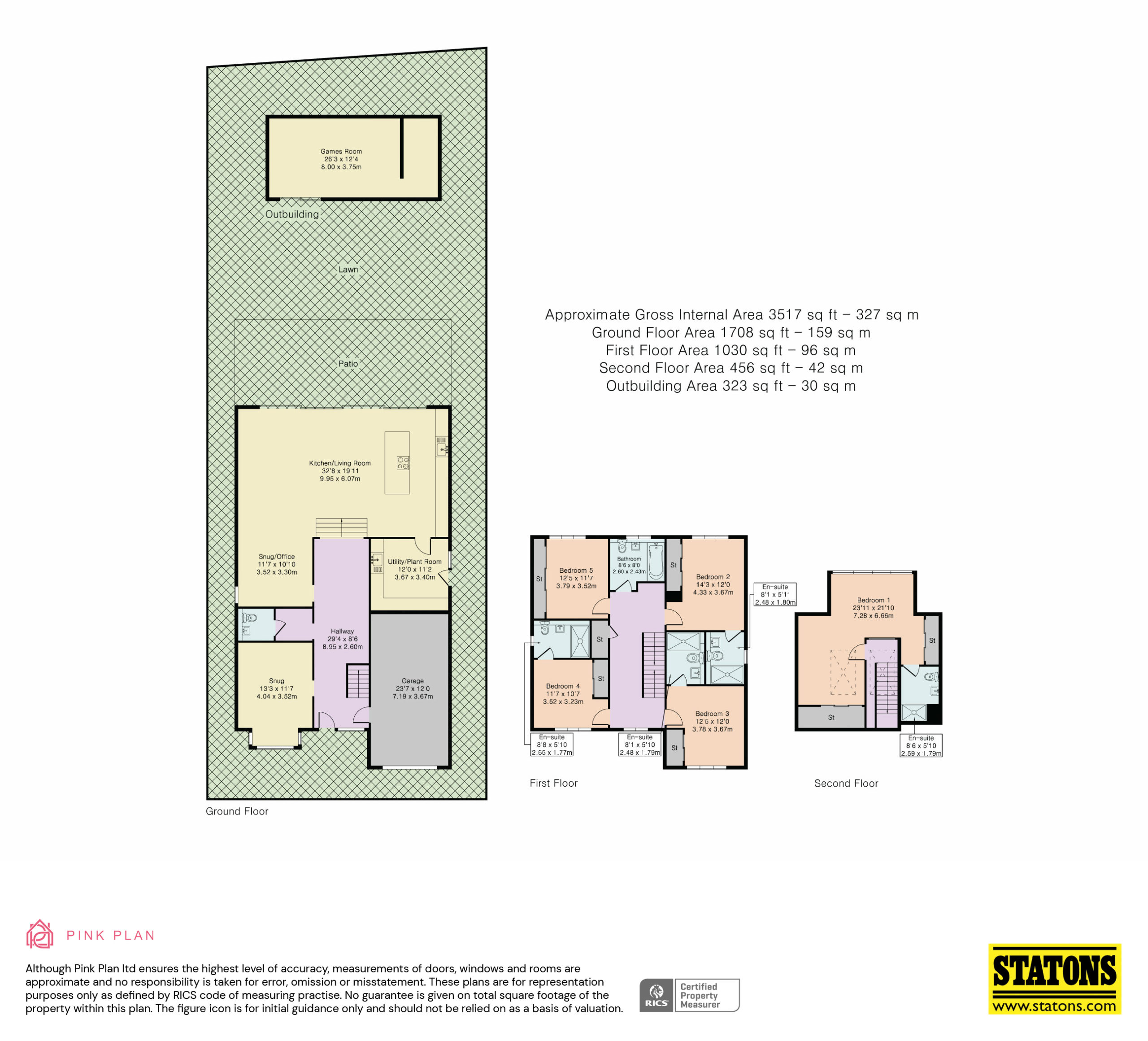 • Five Bath/Shower Rooms: High-specification bathrooms, including four ensuites, a family bathroom with a feature freestanding bath, and an additional guest WC.