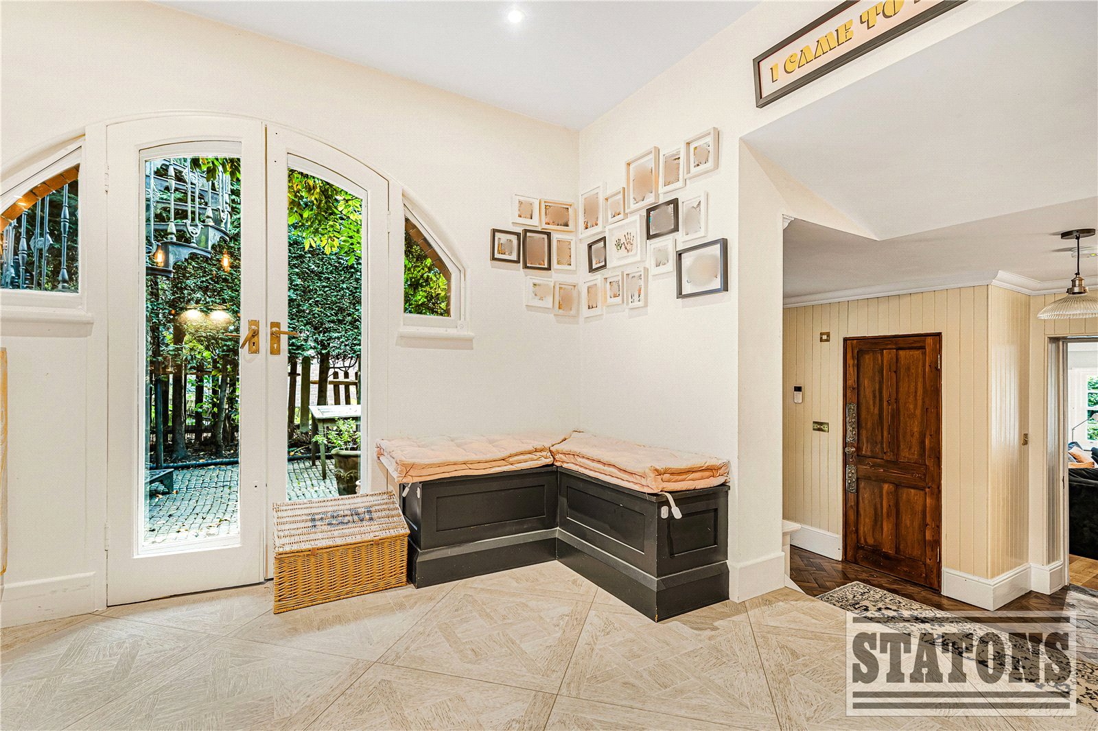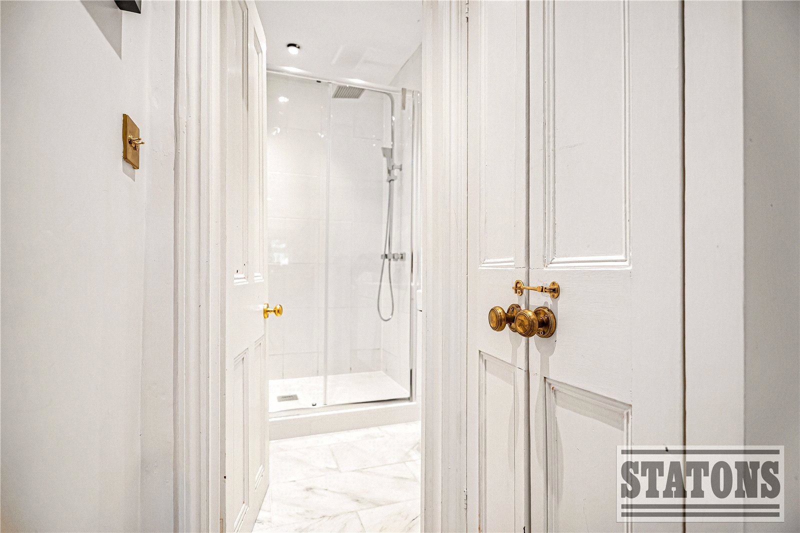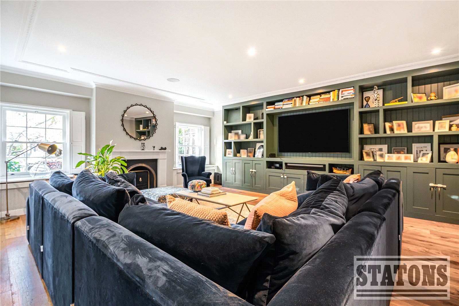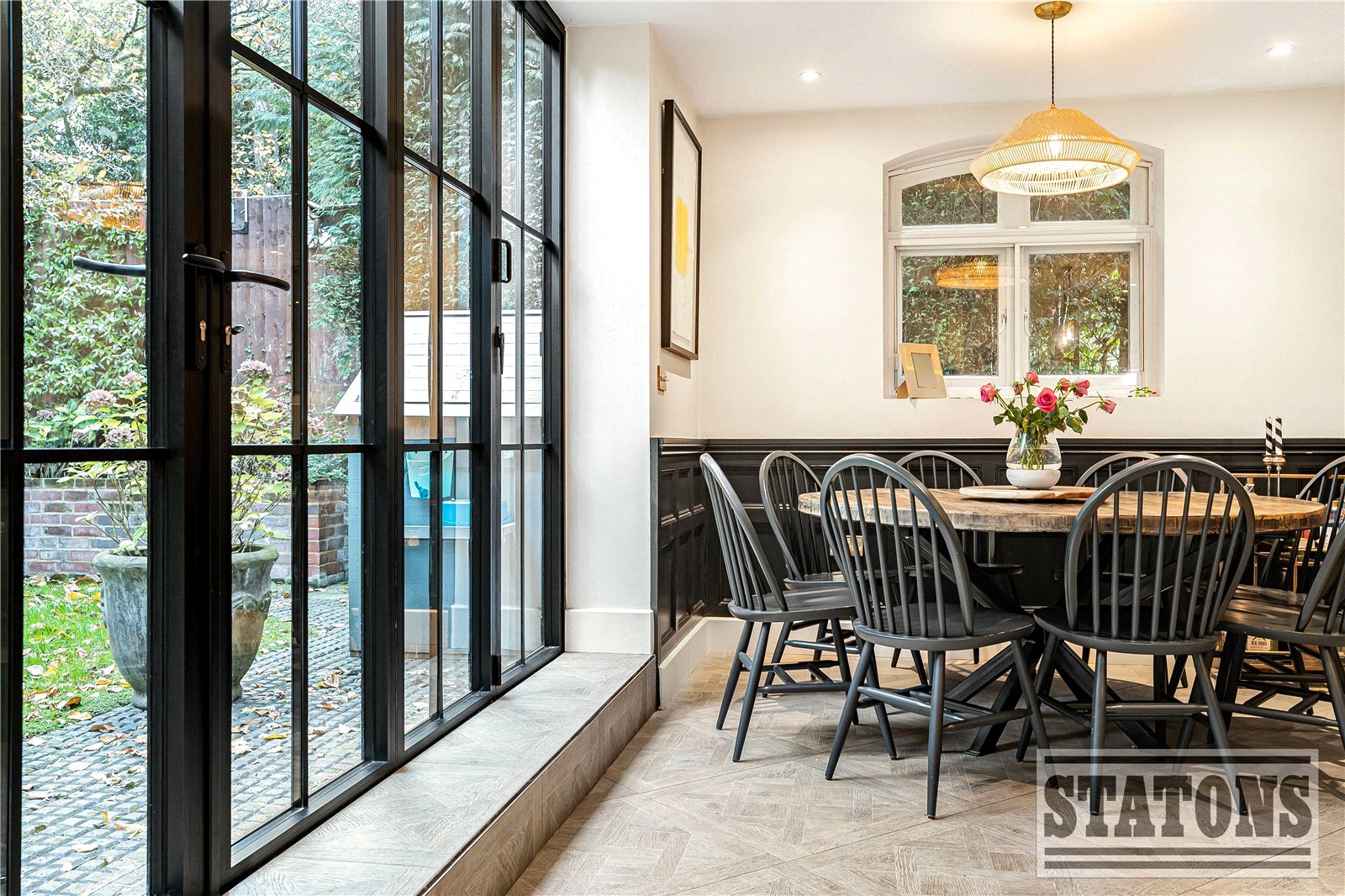 To the rear, a stunning contemporary kitchen/dining room opens onto the garden through bespoke Crittall doors, seamlessly blending indoor and outdoor living. A separate terrace with a spiral staircase provides access to the first-floor balcony, offering a wonderful elevated spot for morning coffee or evening drinks. A guest WC and excellent storage complete the ground floor, while the half-landing features a versatile study area and modern shower room.